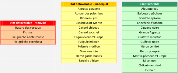 Sur ces 30 espèces remarquables, 14 d'entre elles se trouvent dans un état de conservation "Favorable". Pour douze autres, l'état de conservation est considéré "Défavorable -Inadéquat". Enfin, 4 espèces se trouvent dans un état de conservation "défavorable - Mauvais"